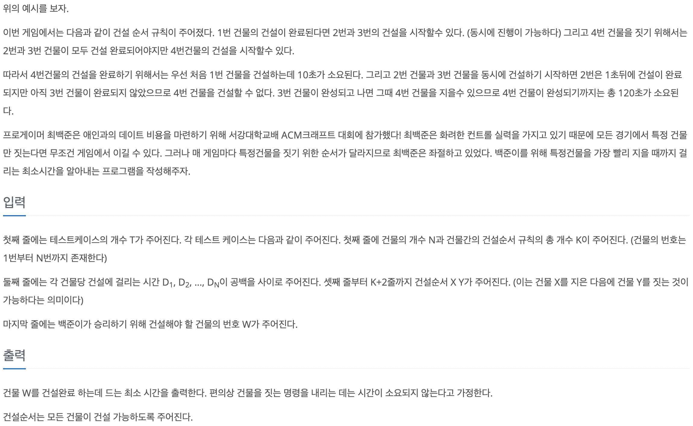 건물 W를 건설하려면 건설 순서 규칙에 의해 규칙을 만족하는 건물들을 지어야 하므로 위상 정렬을 사용했습니다.