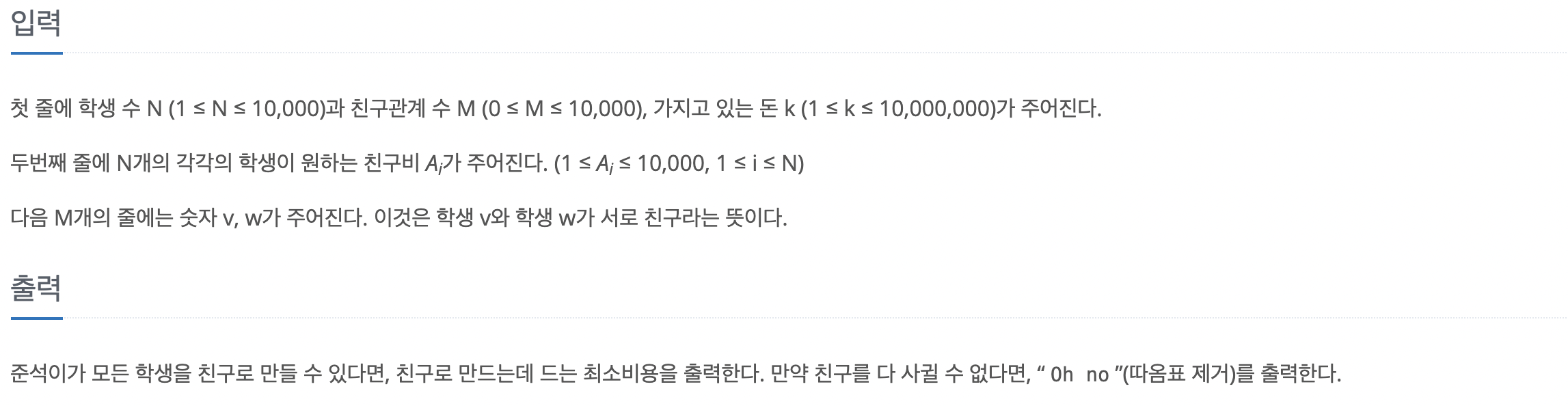 가지고 있는 돈 k 보다 작으면 모든 학생을 친구로 만들 수 있으므로 해당 비용 출력, 가지고 있는 돈보다 친구 비용이 더 크면 다 사귈 수 없으므로 "oh no"를 출력해줍니다.