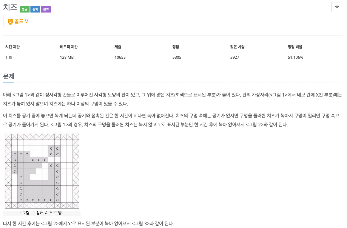 아래 <그림 1>과 같이 정사각형 칸들로 이루어진 사각형 모양의 판이 있고, 그 위에 얇은 치즈(회색으로 표시된 부분)가 놓여 있다. 판의 가장자리(<그림 1>에서 네모 칸에 X친 부분)에는 치즈가 놓