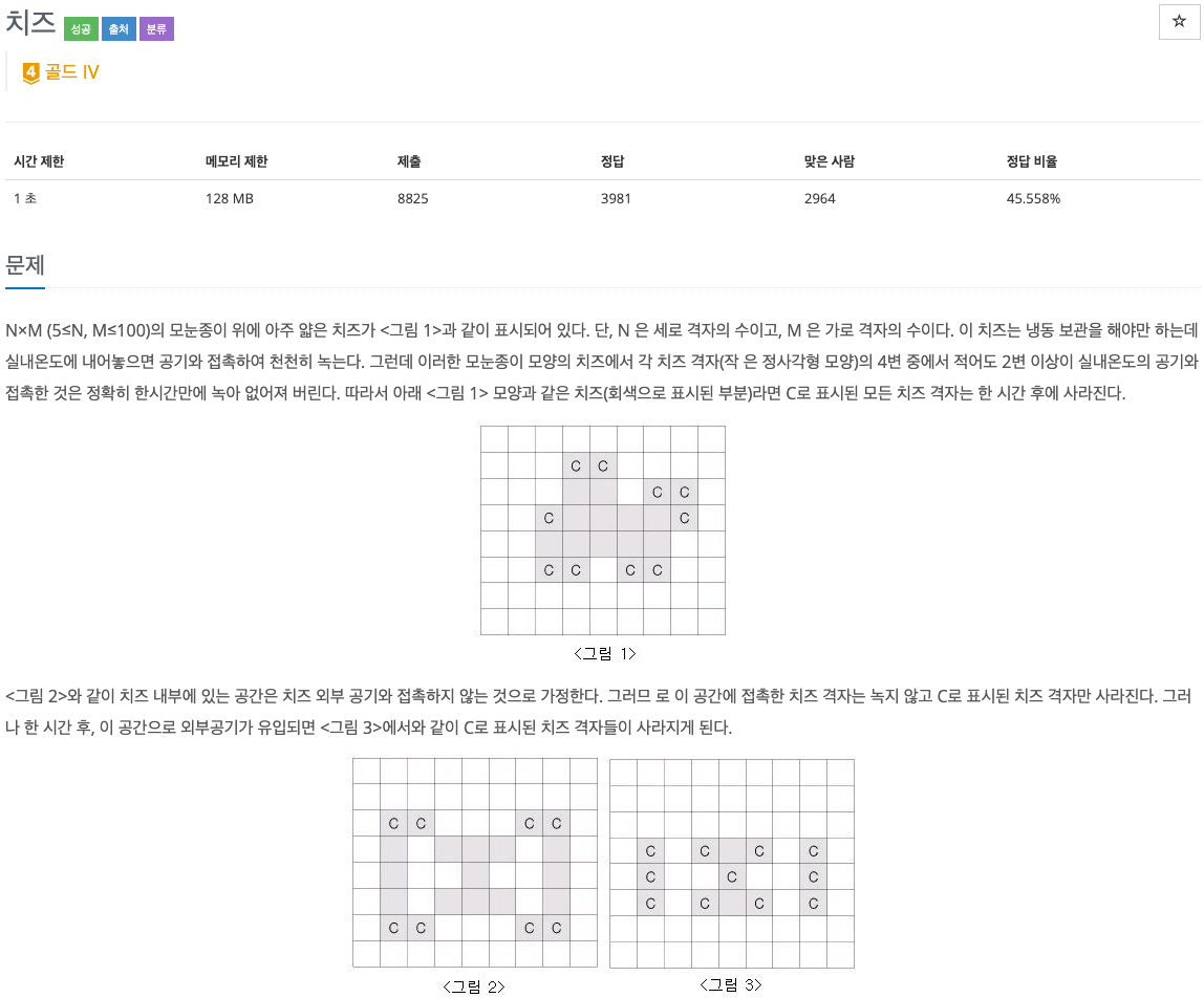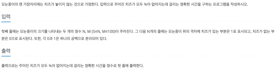 첫째 줄에는 모눈종이의 크기를 나타내는 두 개의 정수 N, M (5≤N, M≤100)이 주어진다. 그 다음 N개의 줄에는 모눈종이 위의 격자에 치즈가 있는 부분은 1로 표시되고, 치즈가 없는 부분은 0으로 표