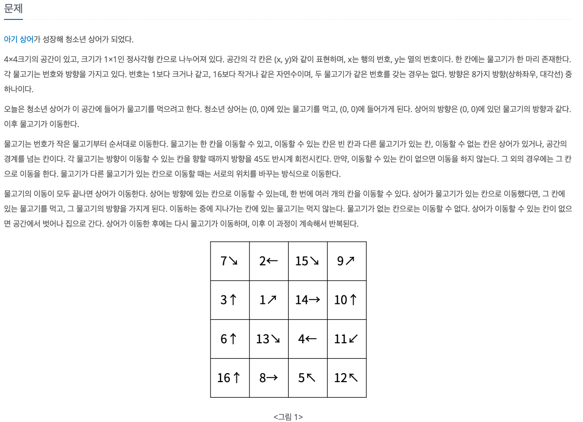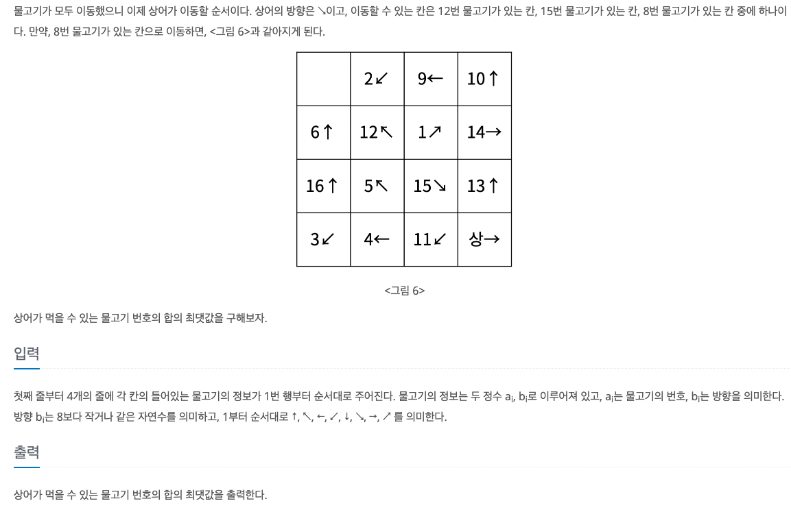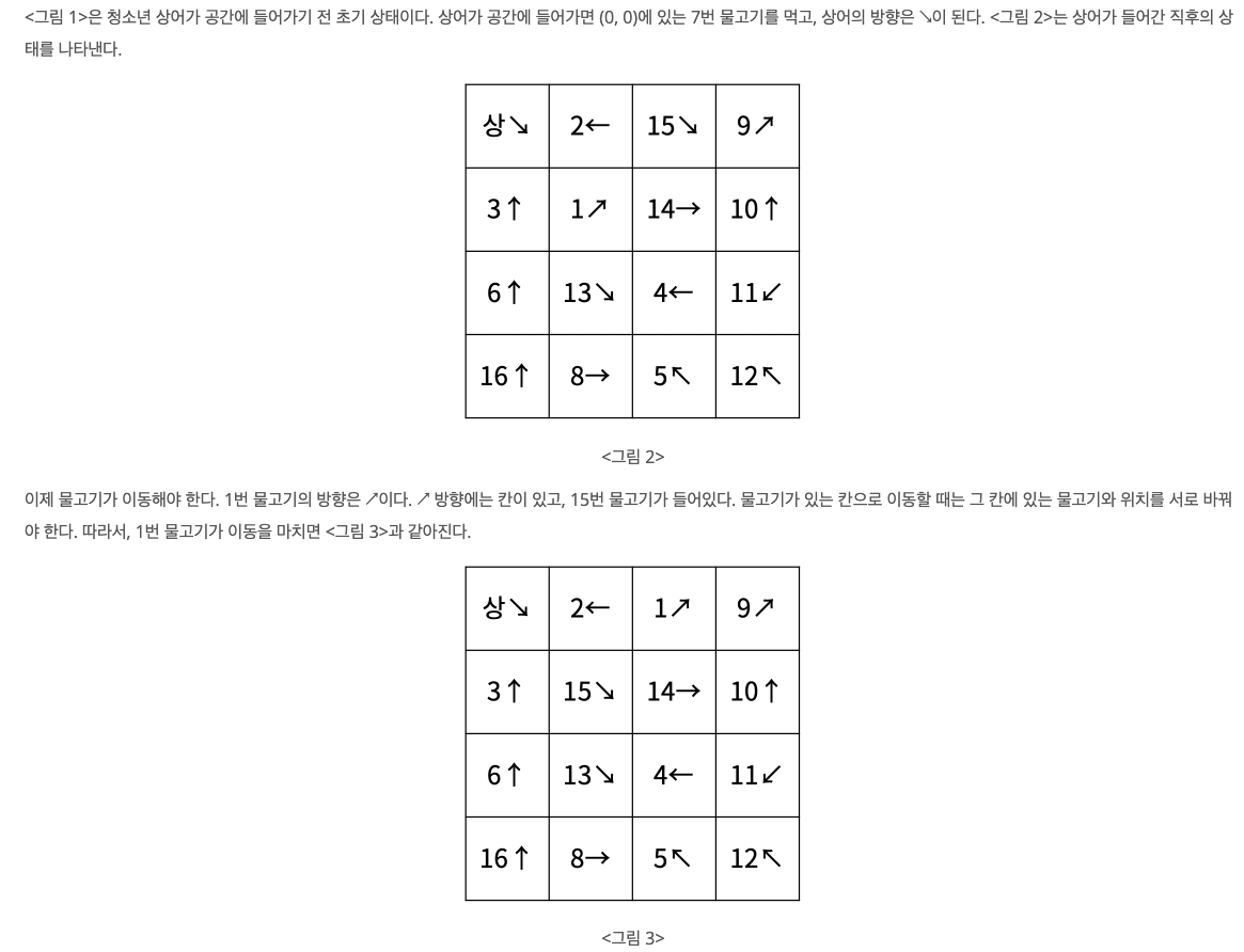 좌표, 방향, 생존여부를 저장할 fish클래스를 생성하여 물고기 배열을 만들어 주었습니다. 4X4 고정 즉 물고기는 항상 16개이므로 크기는 17개로 만들어주었습니다. 상어가 (0,0) 좌표에 있는 물고기를 먹으면서 시작됩니다.