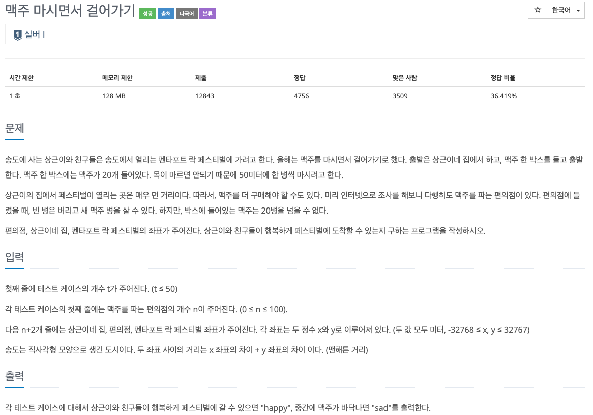처음 시작은 상근이의 집이므로 큐에는 상근이의 집 좌표를 저장, 이동하는 곳으로는 편의점과 락 페스티벌로 입력받은 좌표를 List에 저장하였습니다. 다음 bfs를 돌려 현재 좌표에서 다음 갈 곳의 좌표간의 거리를 구해준 다음 방문을 하지 않았고 맥주가 남아있을 경우에만 큐에 추가해주었습니다. 맥주가 다 떨어지면 방문을 하지 않고 그러다 락 페스티벌에 도착하지 못한 채 모든 방문이 끝나면 sad, 모든 방문이 끝나기 전에 락 페스티벌 좌표에 도착하면 happy를 출력해주었습니다.