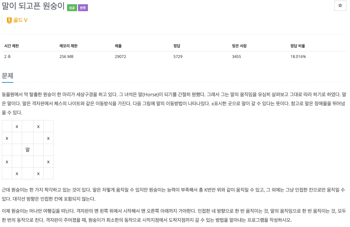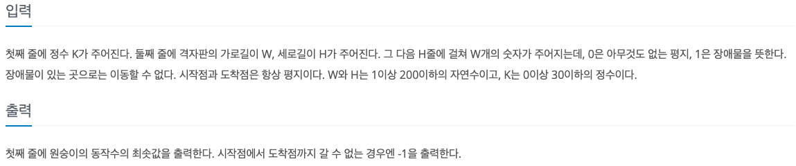 bfs를 돌려 원숭이의 움직임으로 움직이고 만약 현재 원숭이가 말의 움직임을 할 수 있다면 말의 움직임도 구해줍니다.