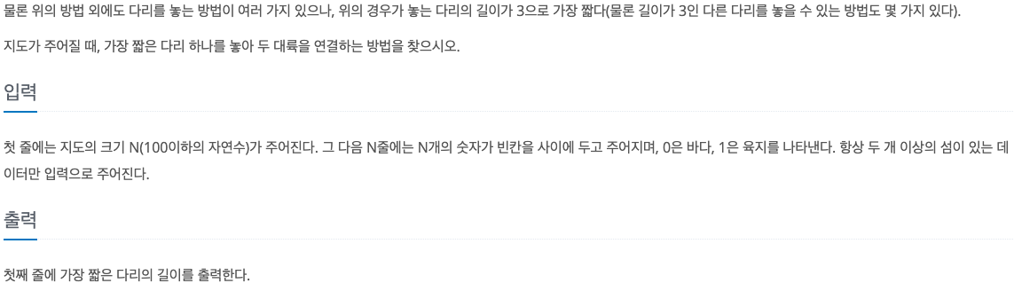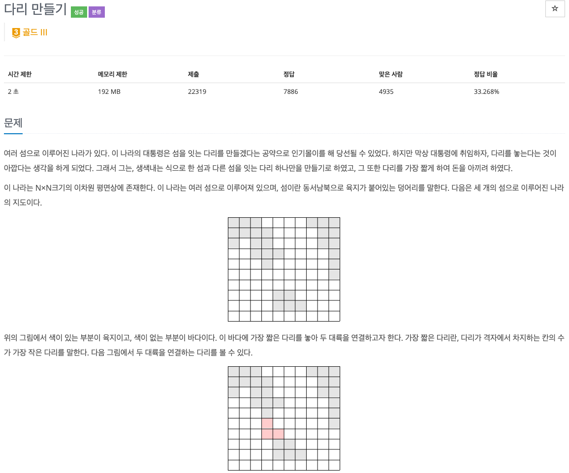 섬에서 갈 수 있는 모든 다리 길이를 구해 최솟값을 찾았습니다. 각 섬의 모든 좌표에서부터 다른 섬까지의 길이를 bfs로 구해줍니다.
