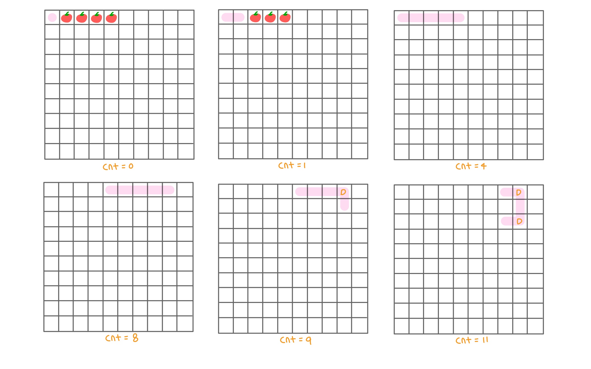 - 뱀의 앞이고 해당 초수에 뱀의 방향 정보가 존재할 때 방향을 바꿔준다.