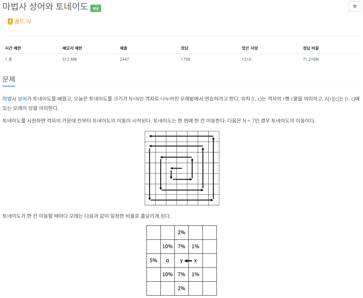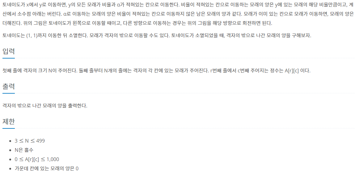 마법사 상어가 토네이도를 배웠고, 오늘은 토네이도를 크기가 N×N인 격자로 나누어진 모래밭에서 연습하려고 한다. 위치 (r, c)는 격자의 r행 c열을 의미하고, A[r][c]는 (r, c)에 있는 모래의 양을