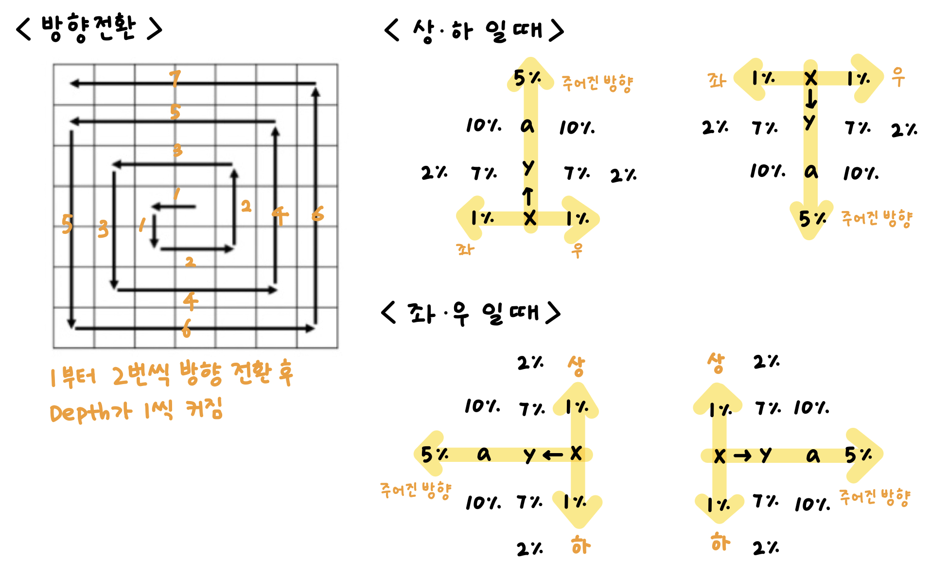 위 그림을 보면 depth가 1부터 2번씩 좌, 하, 우, 상 순으로 방향 전환 후 depth가 1씩 늘어가는 걸 확인할 수 있습니다. - 모래가 흩날리는 과정